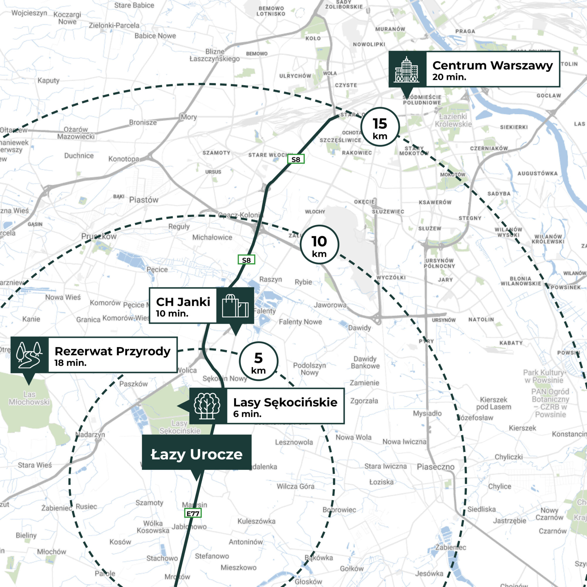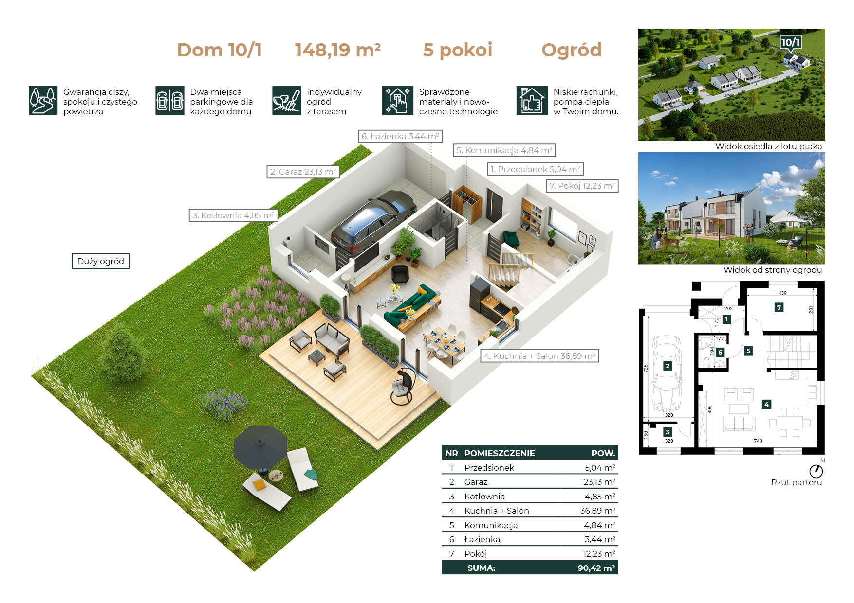 Energo oszczędne domy.Przedstawiamy ofertę nowych domów energo-oszczędnych z łatwym dojazdem do Warszawy.Domy wyposażone w pompy ciepła, rekuperację, ogrzewanie podłogowe, domy otoczone ciszą i zielenią. Dojazd do Warszawy trasą szybkiego ruchu w 20 min. Lokalizacja: Osiedle zlokalizowane jest ok. 20 min jazdy od samego serca stolicy, więc bez przeszkód korzysta się z pełnej infrastruktury miasta. W ok. 10 min można dotrzeć do Centrum Handlowego Janki, w którym znajduje się bogata oferta sklepów i punktów usługowych. Inwestycja zlokalizowana w Łazach w pobliżu Parku Sękocińskiego. Nieruchomość: Domy w zabudowie bliźniaczej przygotowane z myślą o komforcie rodziny. 3 lub 4 sypialnie, 3 łazienki aby ułatwić życie mieszkańców, salon z widokiem na ogród i zieleń. Kominek w salonie. Co wyróżnia te nieruchomości? Deweloper zadbał o dodatkowe wyciszenie ścian od strony sąsiada (podwójne ściany). Izolacja cieplna domu styropianem o grubości 20CM, zamontowana rekuperacja z pompami ciepła. Na całej powierzchni ogrzewanie podłogowe. Izolacja przeciwwilgociowa i przeciwwodna. Dach wykonany z blachy panelowej na rąbek stojący. Rozkład pomieszczeń (10/2): Parter 90,42 m2: