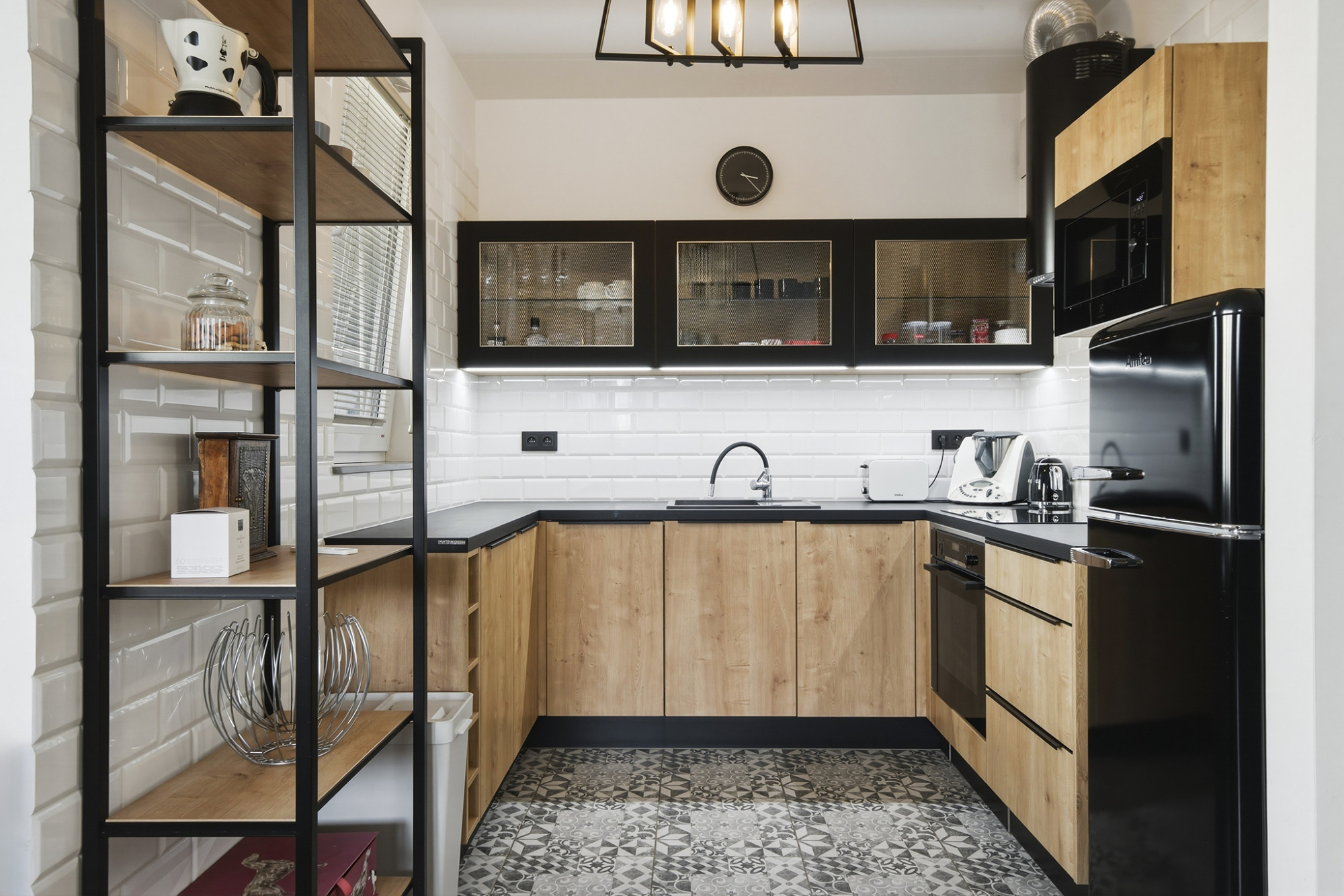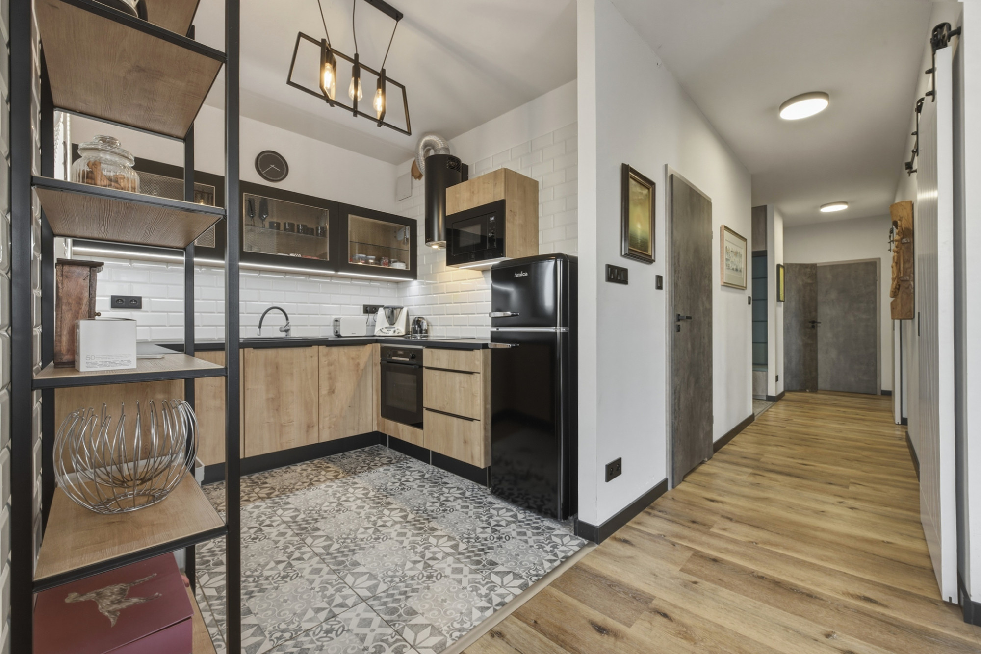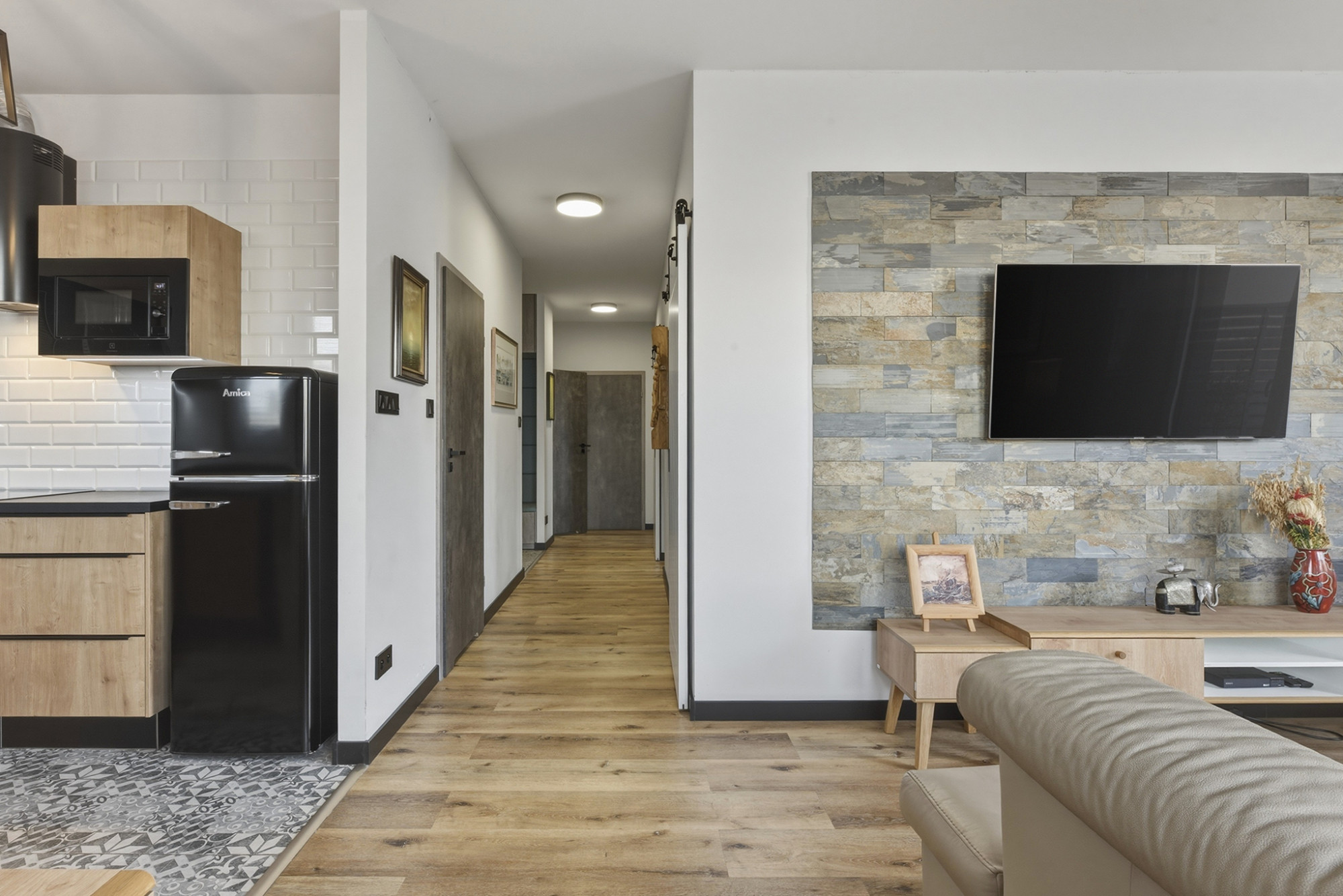 The focal point of the apartment is the bright living room with kitchenette, which creates a comfortable living area and naturally flows into the private garden. The kitchen joinery was custom-made and is very easy to use. This living area is the perfect place for morning coffee, relaxing after work, or meeting with loved ones.