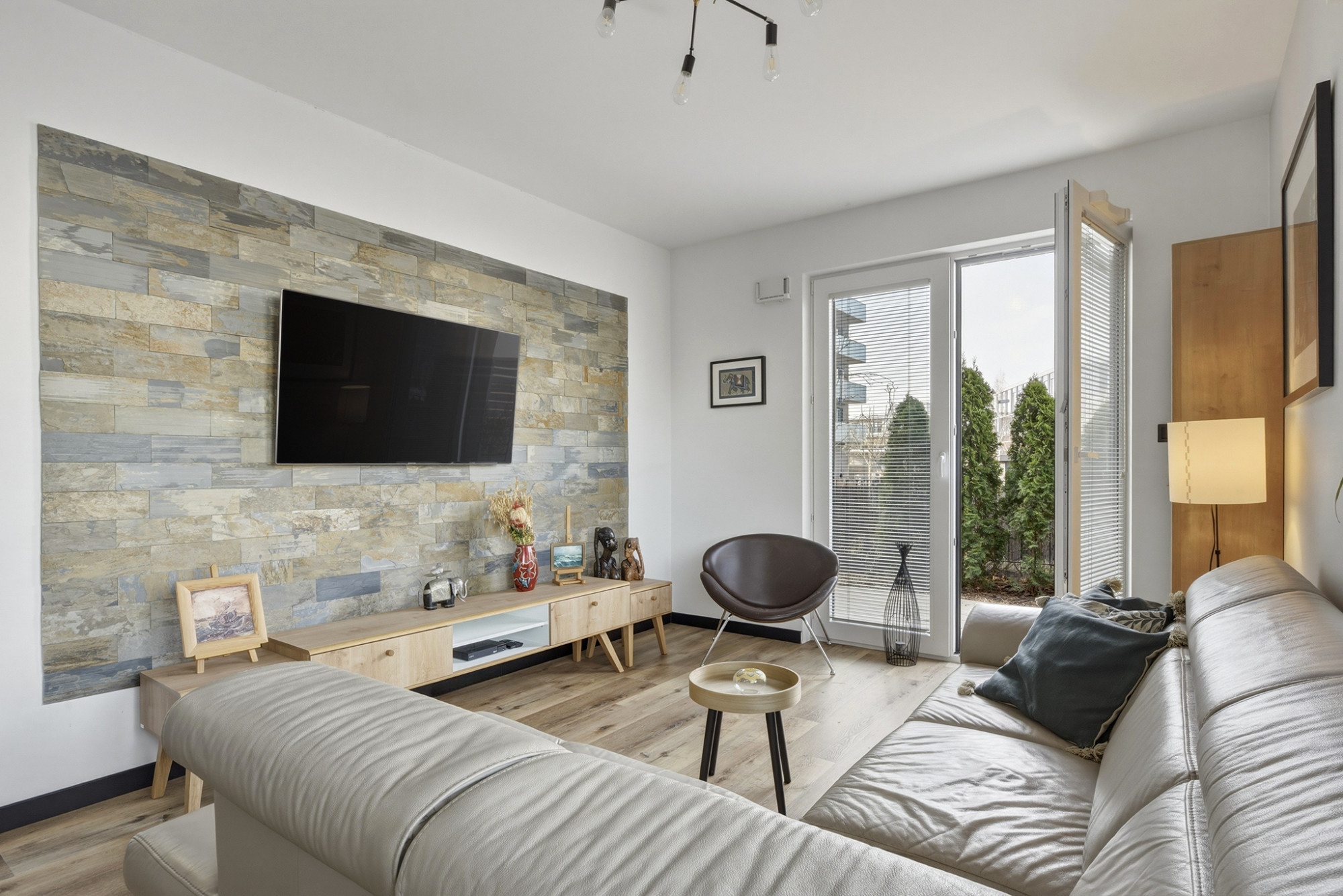 Centralnym punktem mieszkania jest jasny salon z aneksem kuchennym, który tworzy wygodną strefę dzienną i naturalnie łączy się z prywatnym ogródkiem. Stolarka kuchenna była robiona na zamówienie i jest bardzo wygodna w obsłudze. Tutaj część dzienna to idealne miejsce na poranną kawę, odpoczynek po pracy lub spotkania z bliskimi.