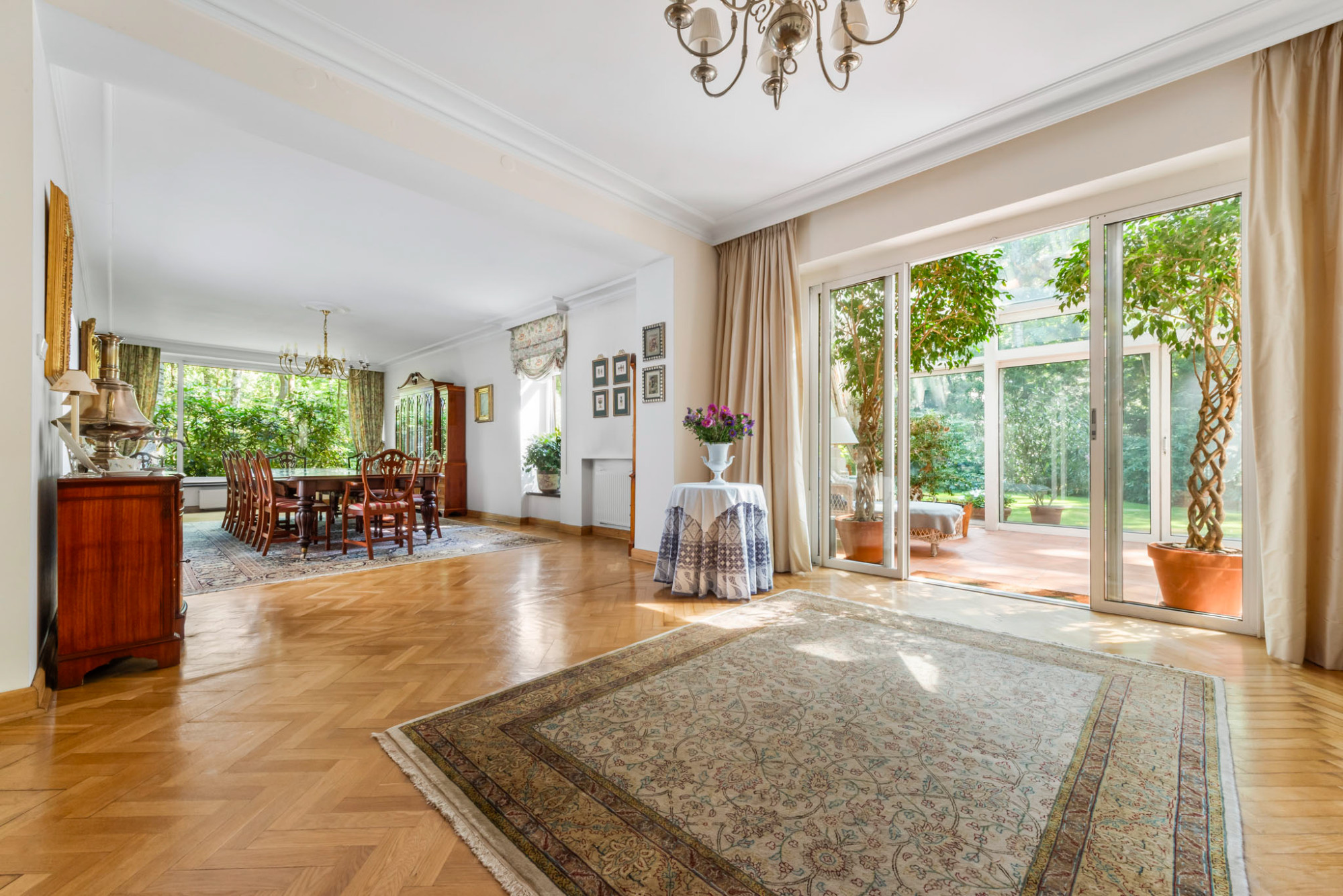 This is a unique property in its character - wooded, extensive corner plot unlike any other in the area, offering a sense of absolute privacy and tranquility. Additionally, there is a one-of-a-kind pre-war house nestled among greenery, creating a truly special atmosphere. In 2001, the house was thoroughly modernized and expanded by the current owners - a left wing was added on the ground floor, along with an entrance hall and winter garden, increasing the usable area by over 130 m². LAYOUT: Ground Floor (237 m²):