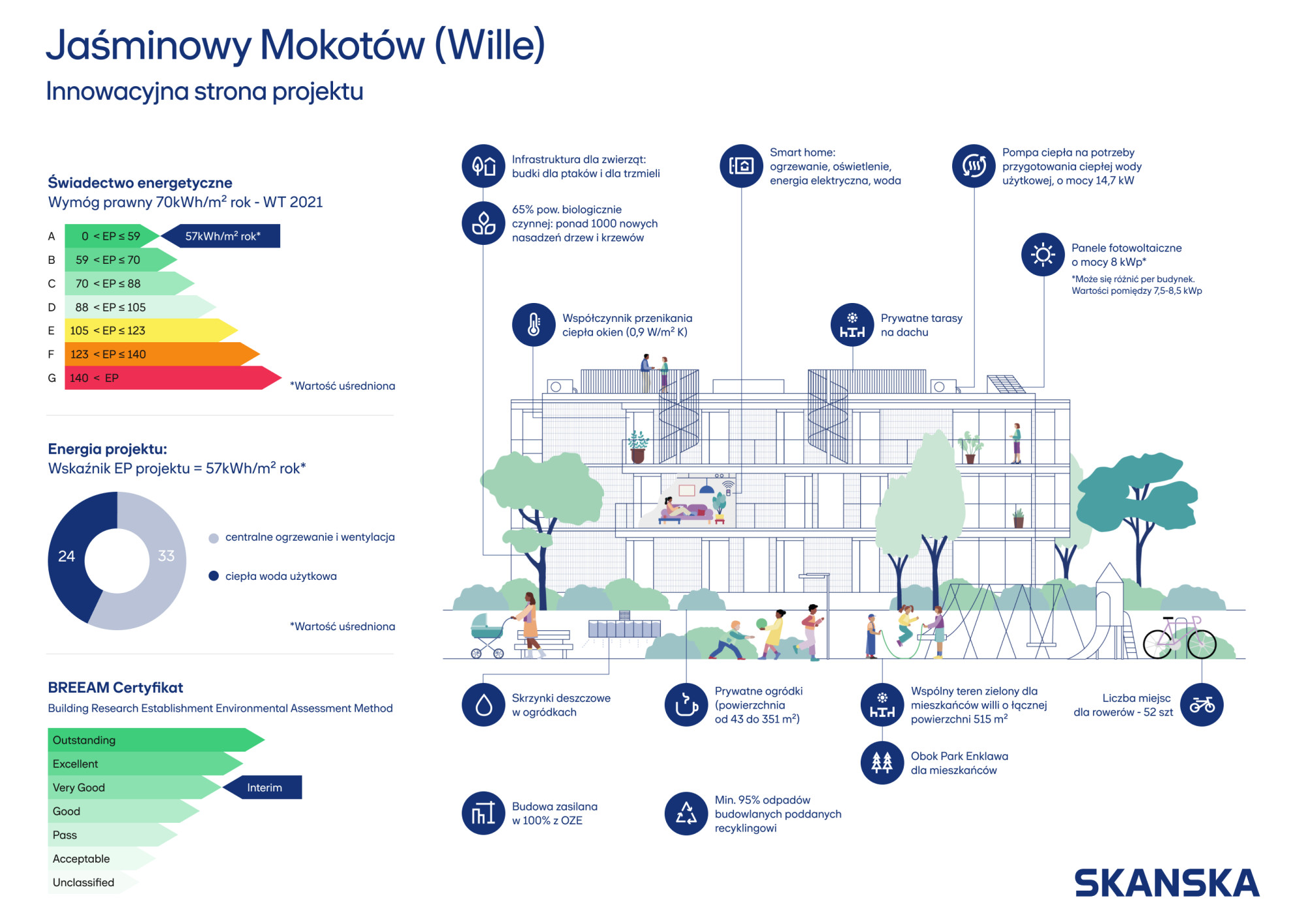 W Jaśminowym Mokotowie VI stawiamy na rozwiązania, które podnoszą komfort życia i dbają o środowisko. Pompy ciepła w willach miejskich zapewniają natomiast produkcję energii na potrzeby przygotowania ciepłej wody użytkowej. Panele fotowoltaiczne: pozwalają na optymalizację rachunków za energię elektryczną i przyczyniają się do ochrony środowiska. System smart home Appartme: pozwala na pełną kontrolę nad zużyciem energii i wody, optymalizując swoje wydatki. Certyfikat BREEAM na poziomie „Very good”. Co więcej, ponad połowę powierzchni działki stanowi powierzchnia biologicznie czynna, co pozwoli na naturalną wegetację roślin i retencję wód opadowych. SZCZEGÓŁY OFERTY