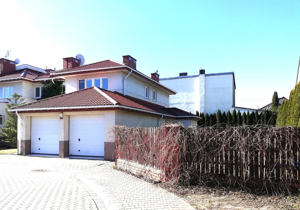 Dom w zabudowie szeregowej, skrajny segment. otoczony dużą działką w kształcie litery L.