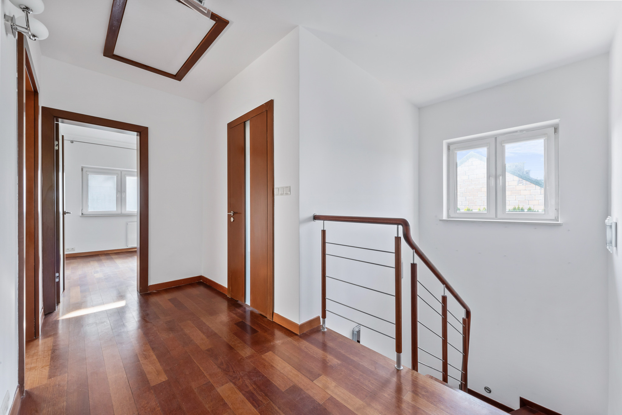 Ogrzewanie podłogowe w całym domu. Na podłogach gres i parkiet mahoniowy. Liczne szafy zabudowane.