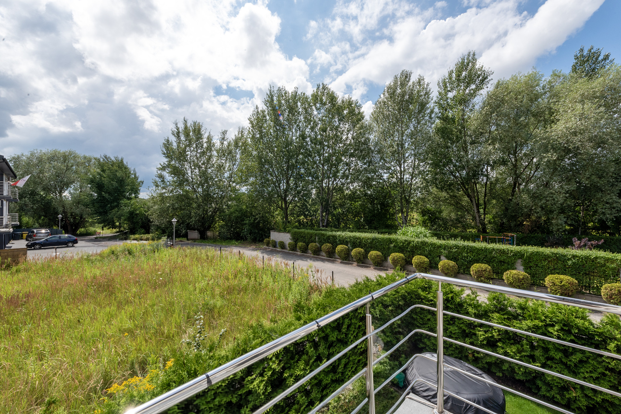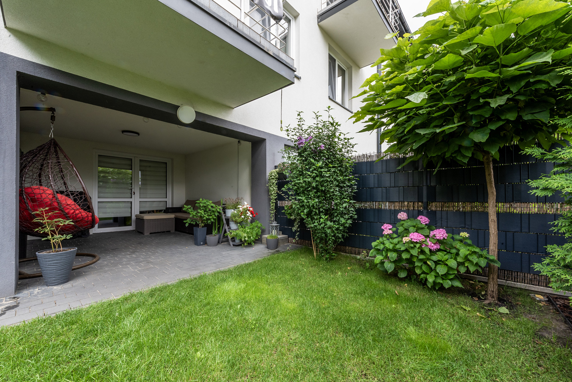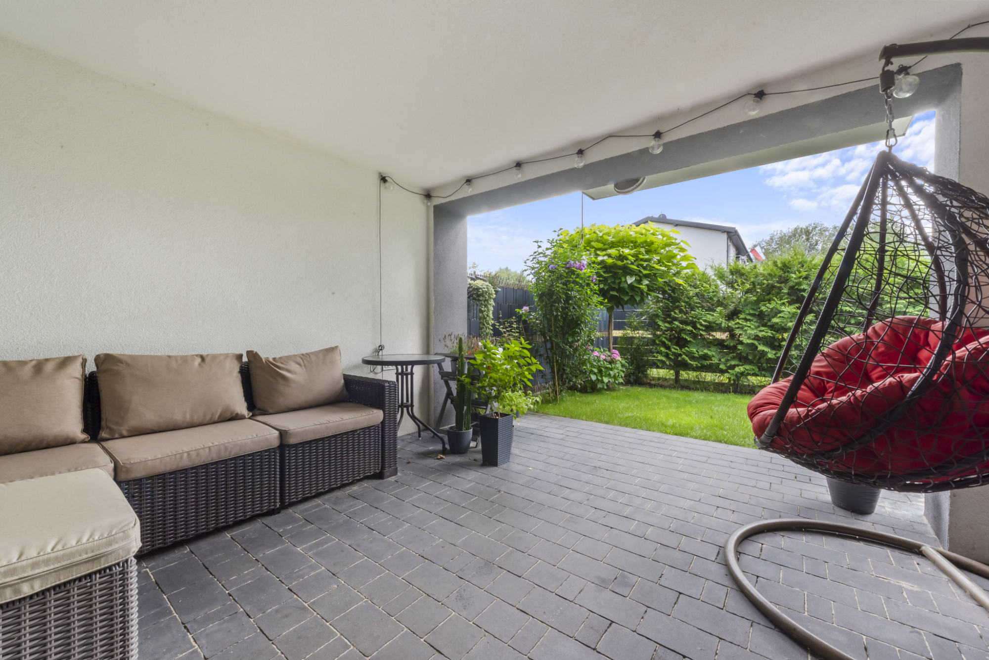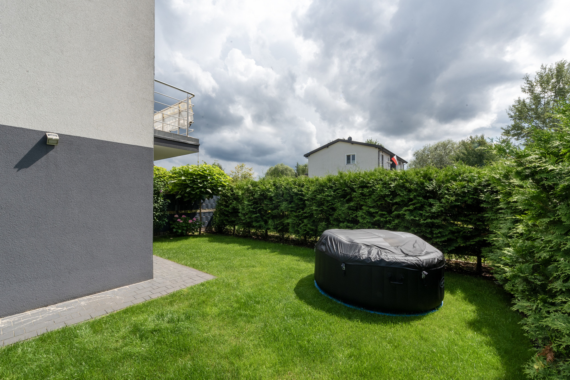 NIERUCHOMOŚĆ Budynek został wybudowany około 6 lat temu przy cichej i spokojnej ulicy dojazdowej do sąsiednich domów jednorodzinnych. Z uwagi na niewielką ich ilość oraz fakt, że droga nie łączy się z inną otrzymujemy wyjątkowo przyjazną dla rodzin przestrzeń sprzyjającą do spacerów i spędzania czasu na świeżym powietrzu. Dwustronne mieszkanie, którego okna wychodzą na południe oraz północ mieści się na pierwszym piętrze budynku. Na parterze znajdziemy wyjątkowo duży garaż, otwarty pokój zimowy, który doskonale uzupełnia rekreacyjną funkcję ogrodu. On sam jest wyjątkowo zadbany - zarówno trawa jak i drzewka - w czym pomaga system nawadniania. Przed budynkiem mamy wyznaczone trzy stanowiska do parkowania samochodów. ROZKŁAD POMIESZCZEŃ