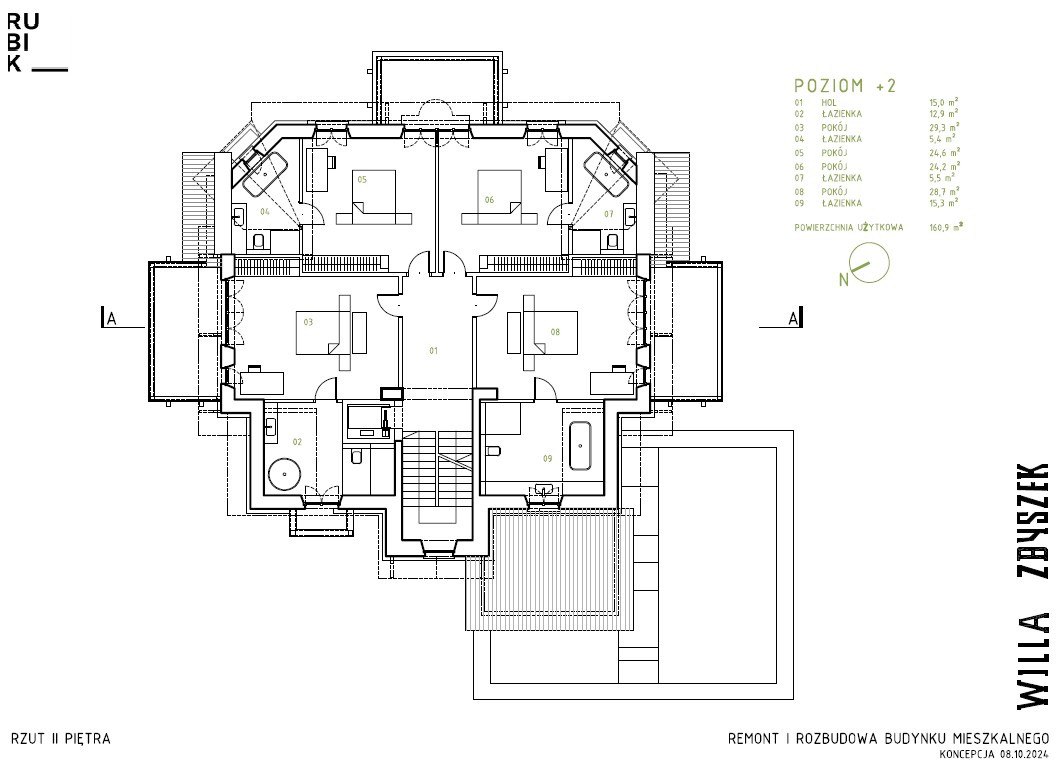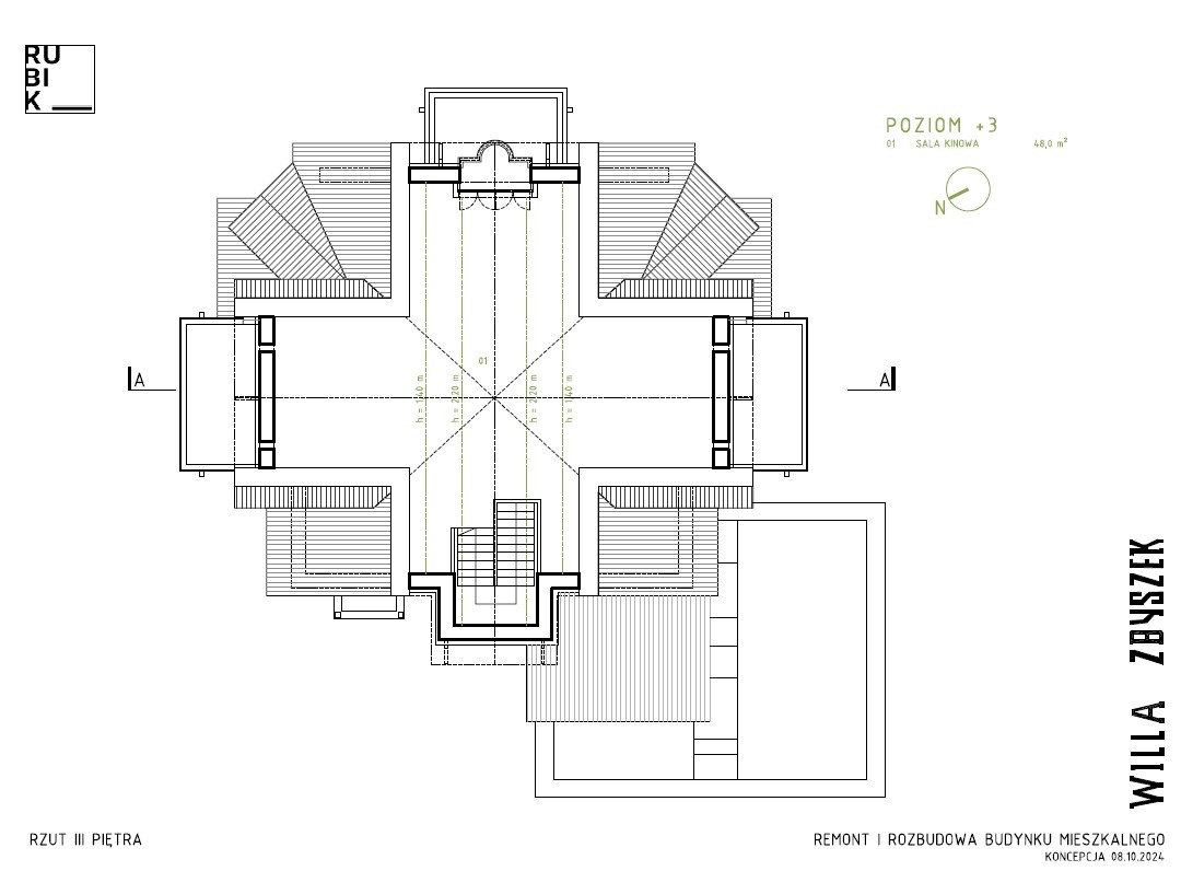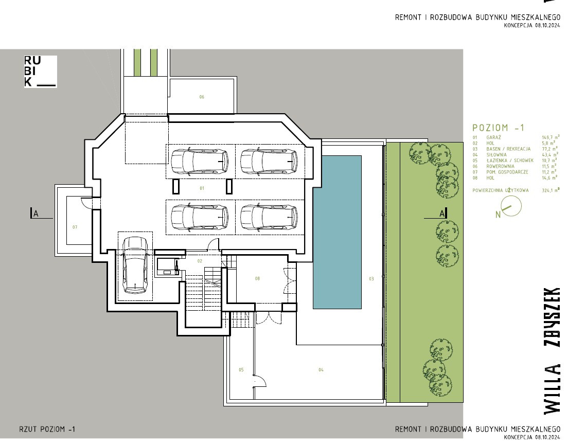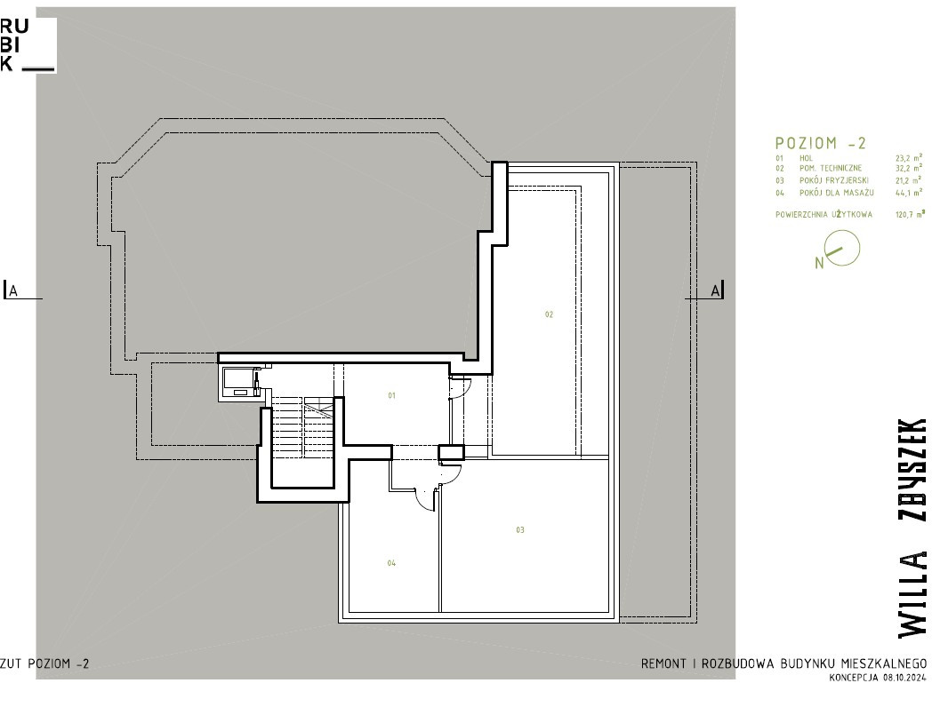 ROZKŁAD Poziom -2: hol, pomieszczenie techniczne, pokój fryzjerski, pokój do masażu Poziom -1: garaż, basen, siłownia, łazienka, rowerownia, pom. gospodarcze Parter: hol z werandą, salon, kuchnia z jadalnią, spiżarnia, mini apartament, bar/biblioteka, garderoba, toaleta I piętro: hol, pokój hobby, sypialnia, garderoba, łazienka, 2 werandy II piętro: hol, 4 pokoje, 4 łazienki III piętro: sala kinowa