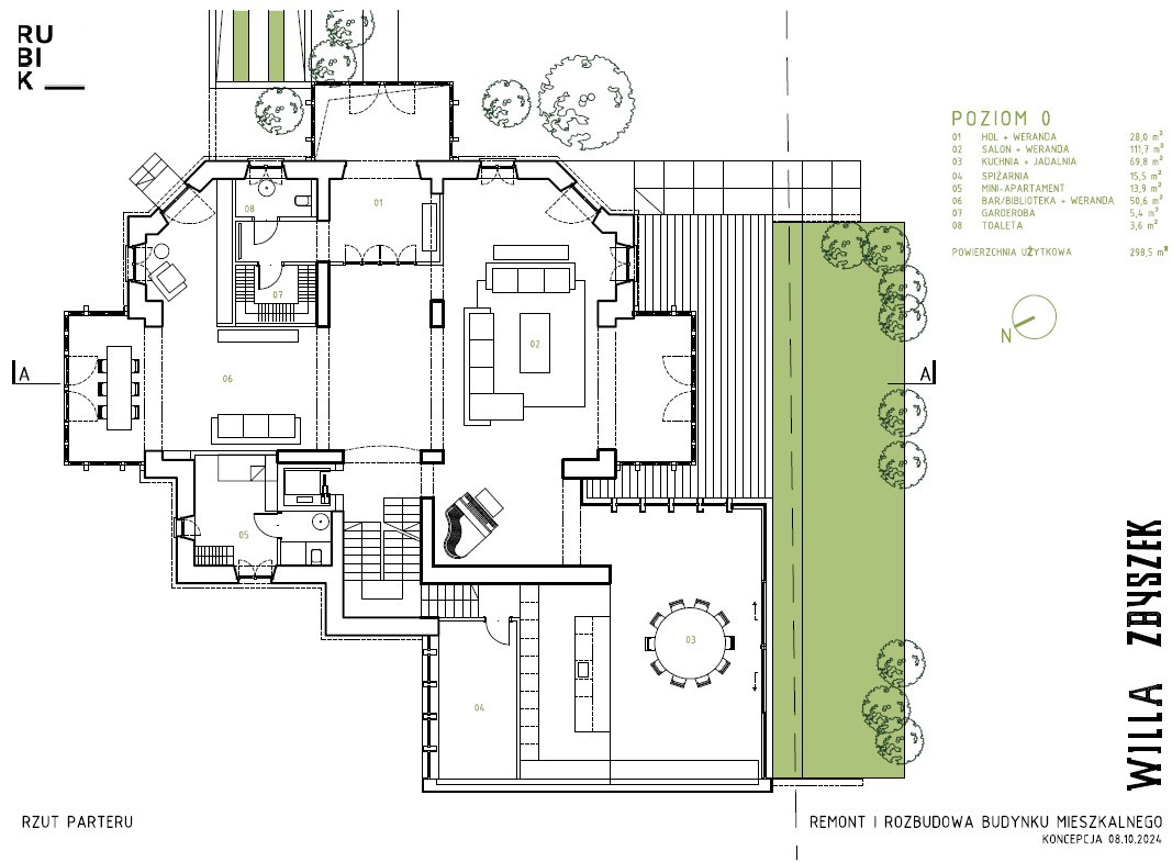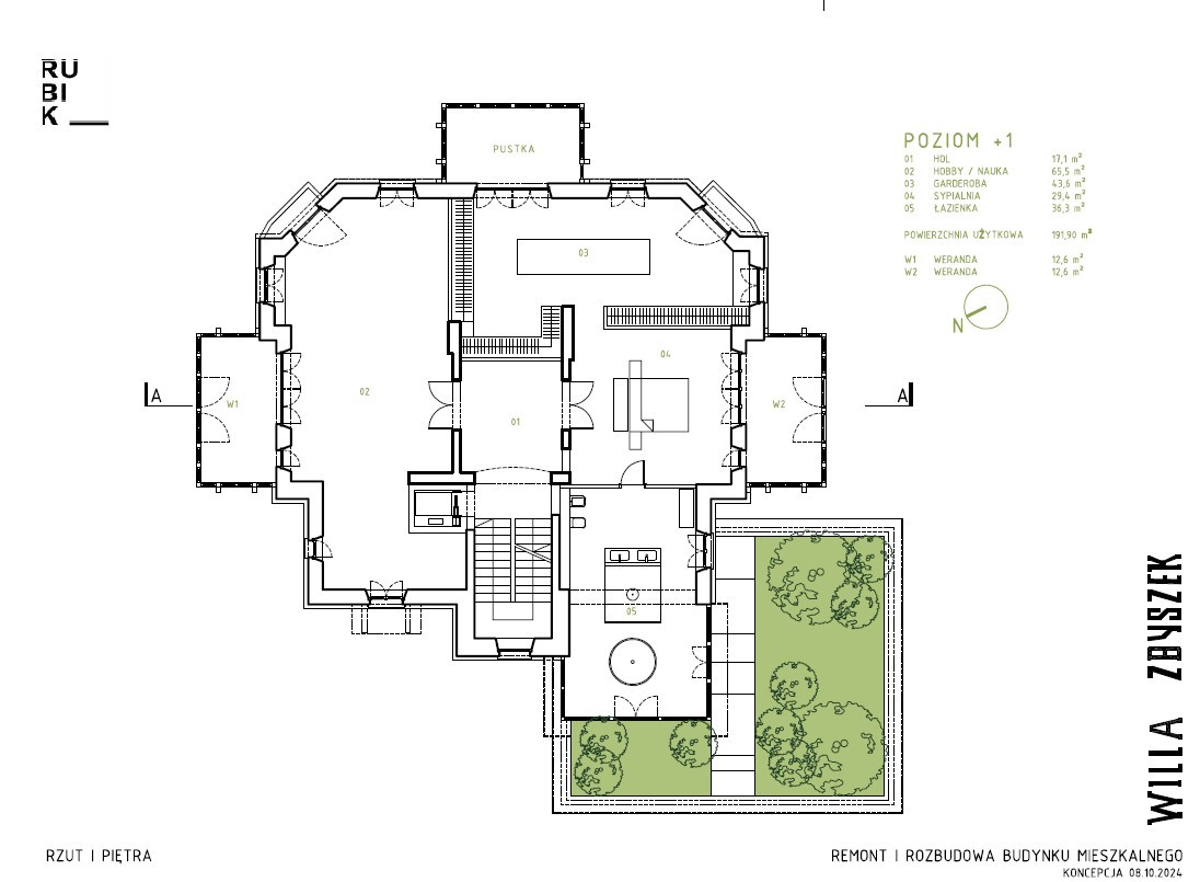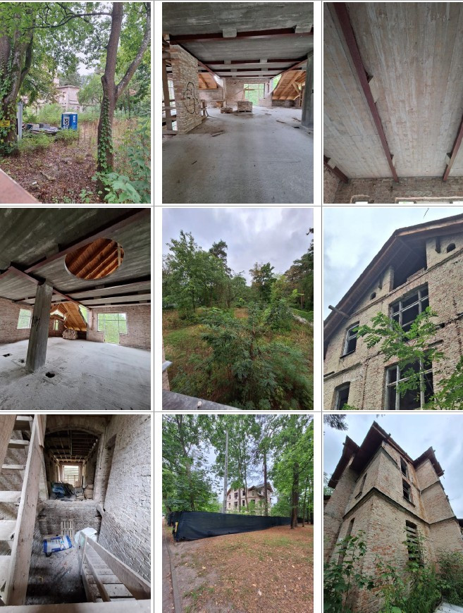 Zakres prac obejmował m.in.: - zachowanie oryginalnej bryły i wielopołaciowego dachu z dachówki ceramicznej, - odtworzenie werand, balkonów, snycerki i stolarki, - wykonanie nowoczesnych instalacji (elektryczna, wodociągowa, kanalizacyjna, grzewcza - pompa ciepła, ogrzewanie podłogowe, system alarmowy, internet), - dodanie garażu podziemnego oraz szybu windowego, - budowę niewielkiego budynku ochrony przy wjeździe na posesję.